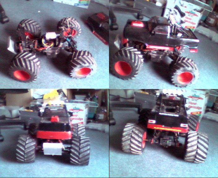 Umgebaut auf 50mm längerer Radstand und 20mm Spur auf jeder Seite machen ihn noch größer! Ausgereifter Antrieb mit Mittelgetriebe und Kegelraddifferenzialen machen ihn echt unaufhaltsam. Leider war die Aufhängung absoluter Much (knickte zusammen, da nix doppelte Aufhängung!) und so waren mehr wie 10mm Federung vorne einfach fuer ein Monster dieser Größe zu wenig!